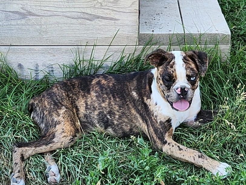 Zephyr, is our stunning flashy brindle merle female. She is middle tempered with a balanced between being reserved, and a crazy boxer when it suits her. She loves toys and to explore the farm with the kids.