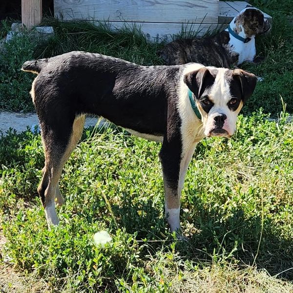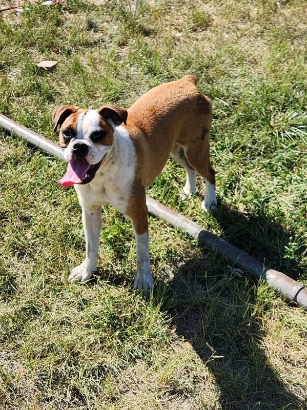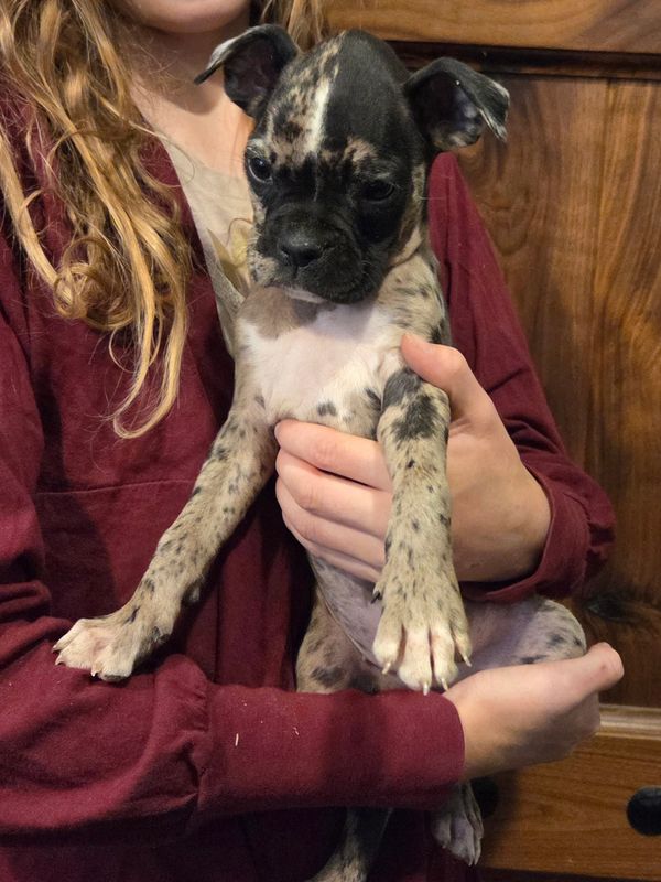 Our newest future momma. Yana is a very small multi generational nearly pure boxer mini boxer girl. She should mature right around 25 to 30 lbs. She is a black merle. She is our only female that can  have true black puppies.